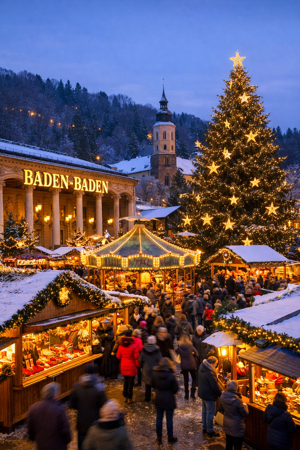 Petit déjeuner. Direction Baden-Baden et visite du marché de Noël. Un conte de fées hivernal d’un genre particulier vous attend sur le marché de Noël traditionnel devant l’hôtel thermal de Baden Baden. Le bonheur de Noël dans le flair de la ville inscrite au patrimoine mondial, encadrée par les montagnes de la Forêt-Noire. Vous retrouverez de nombreux stands proposants des spécialités locales ainsi que de nombreuses friandises de Noël mais aussi des produits et objets artisanaux. Déjeuner et l’après-midi, route vers Gengenbach. Découverte du marché de Noël et dégustation d’une forêt noire. La ville de Gengenbach, crée l’événement avec son marché de Noël, son calendrier de l’Avent géant avec ses 24 fenêtres et ses